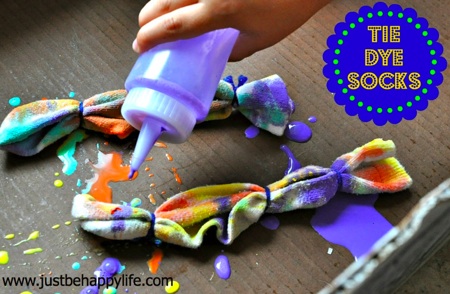 You will need coloured dyes, cotton socks and elastic bands for this one. Dye the socks and each child can take them home in a sealed bag to wash out the next day.