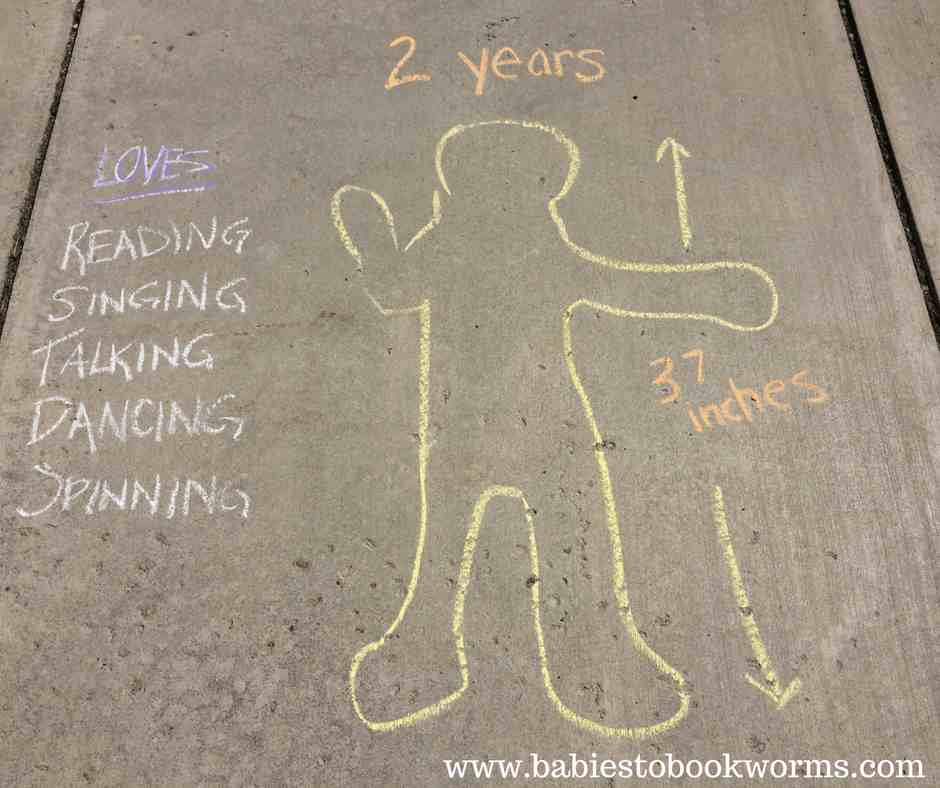 Love this idea from Babies to Bookworms to draw an outline of them and share some of their favourite things. You could also do this on a huge piece of paper indoors.