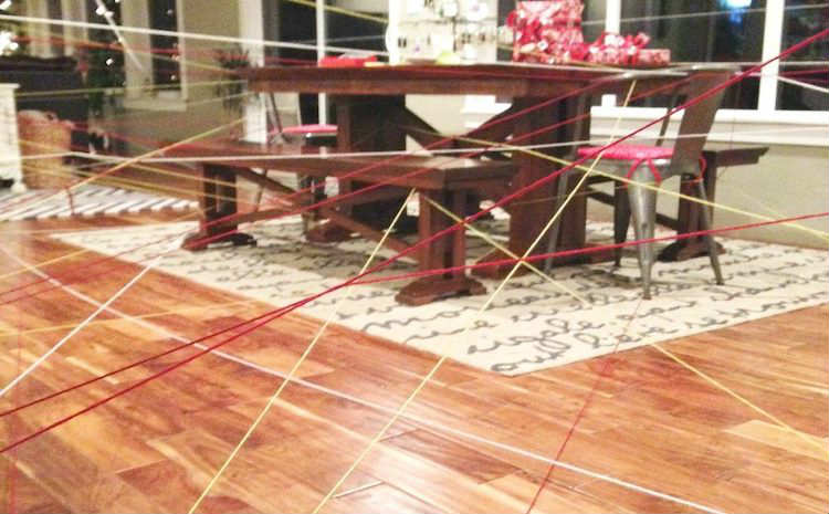 Using small balls of wool in several different colours (one colour for each player), attach one end of the first colour to a pencil and then string the wool around the room, going under, over, around, and through furniture like this version from How Does She. Cut the string and begin again with another pencil. Repeat this process until you have one string for each child.