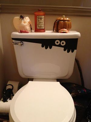 Cut a scrap piece of black paper at an angle, cut out some fingers, and punch out the eyes. Tape the face onto the toilet.