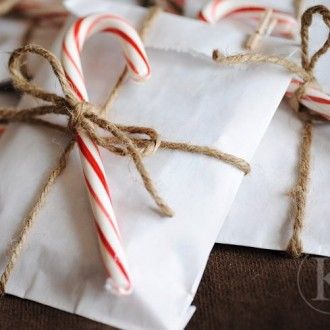How effective is this idea? Use white paper with string tied around and a candy cane stuck in. It looks so stylish for such a simple idea! Even I could do this!