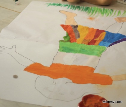 Trace around your toddler, including the outline of their clothes and let them loose on their self portrait. I use rolls of easel paper for this activity, but you could use old rolls of wallpaper or just draw with chalk on the pavement on sunny days.