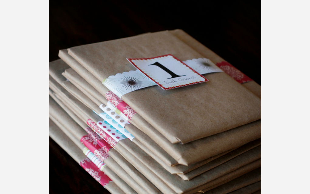 What a sensational idea for fun and festive decor! This advent wreath from Oh Happy Day features little gifts (sweets, temporary tattoos, stickers, hair clips, or a ticket for a family activity. Each one is wrapped in coloured crepe paper and stuck to a wire frame (you could make this from a wire coat hanger if you can’t find it at your local craft store).