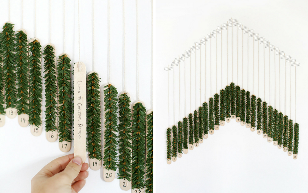 This simple idea of using craft/lollipop sticks to create your own homemade advent calendar is chic and effective. The Merry Thought used fake greenery to decorate the craft sticks, but you could paint, decorate or use wrapping paper instead.
