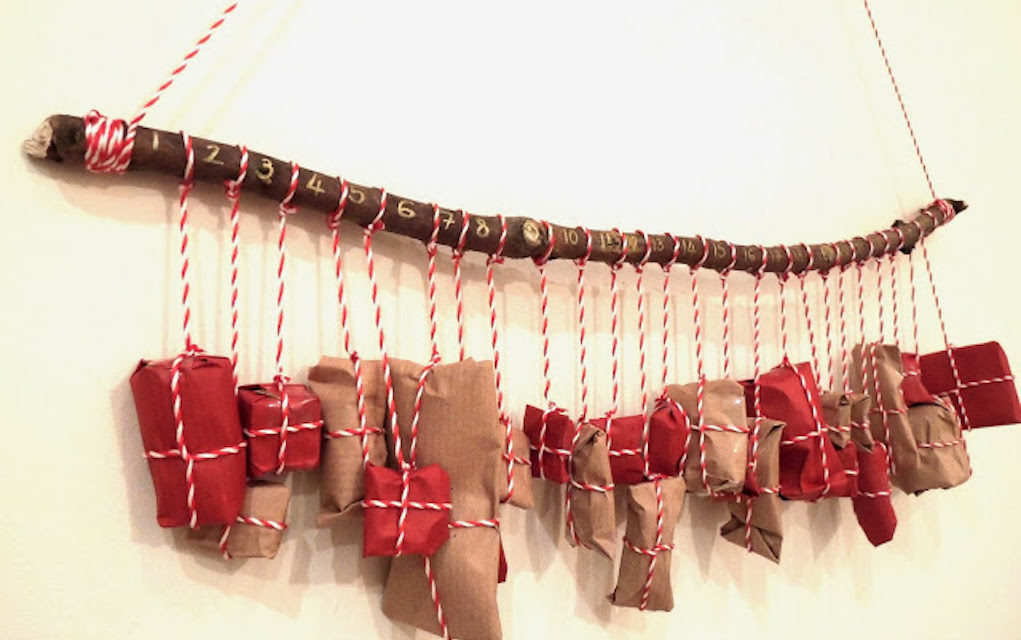 The Li’l Sparrow came up with a really eye-catching (and easy!) idea for a homemade advent calendar by using a large stick, some gold paint and individual wrapped gifts.